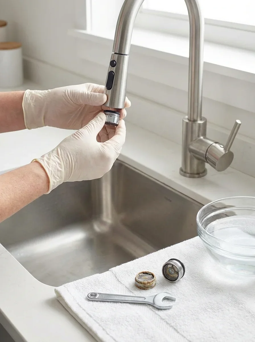 Discolored water when you first turn on a tap means rust. It clears after a few seconds because you're flushing out sediment that settled overnight. That sediment is your pipes dissolving. Low water pressure across multiple fixtures — not just the shower, not just one bathroom — indicates buildup choking the lines. Scale reduces flow by 30-40% in older copper systems.